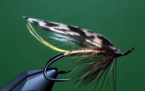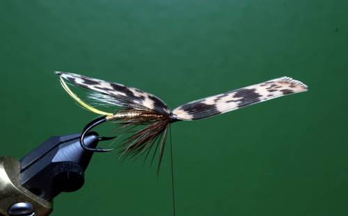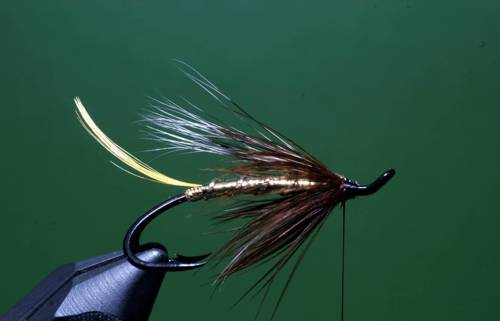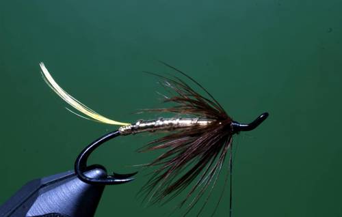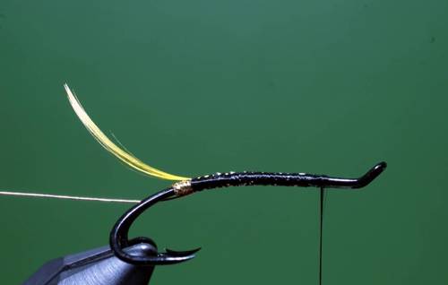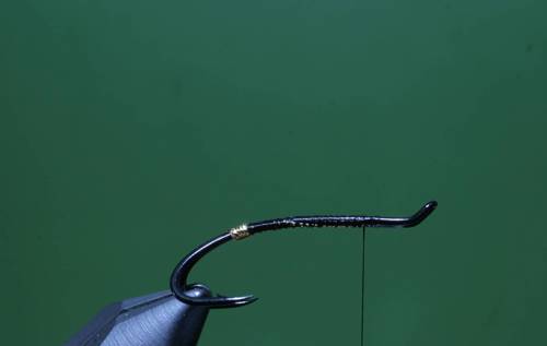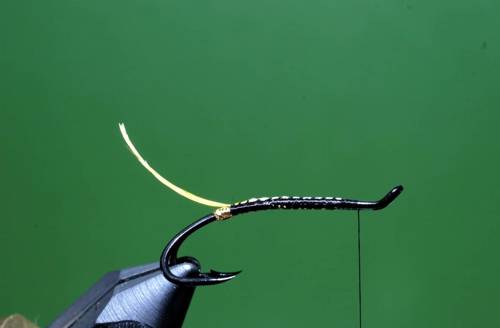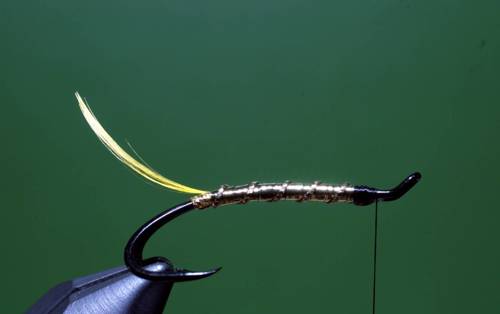 Efter indbinding af rib, tørnes tråden frem til sidste indbindingspunkt, her bindes en flad guldtinsel ind, som tørnes ned til halen og tilbage til front af fluen igen, kroppen ribbes med fem tørn, og rib fastgøres.