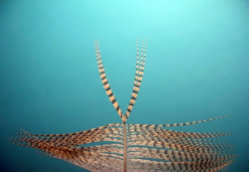 Før tråden ind imellem krogskaftet og fjeren, og lav 5-6 tørn rundt om fjerens indbindingspunkt, hvilket får fjeren til at løfte sig lidt fra krogen. Før derefter tråden op over fjeren igen, og afslut med et enkelt tørn rundt om fjer og krog.